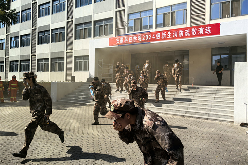 在疏散演练中,各连军训教官为学生讲解消防应急疏散知识及注意事项,保卫处指挥组安排各学院辅导员和物业管理人员进行疏散路线引导,安排医务人员和应急队伍进行现场保障,学校消防微型消防站队伍进行灭火救援,组织消防维保和专业人员营造演练场景。全体新生按照预定演练方案,在急促的消防警报声中,用事先准备的湿毛巾掩住口鼻,俯身快速穿过演练浓烟,有序疏散到室外安全区域。
