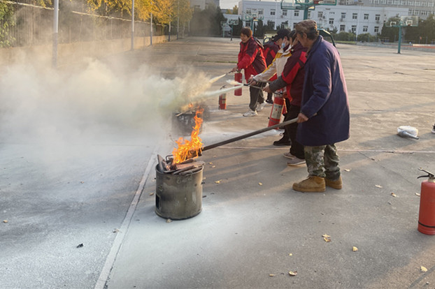 演练前,王婉兴首先细致讲解了物业服务人员日常巡查检查的要点;普及校园火灾的常见原因及其危害、预防措施;阐述初起火灾扑救方法、报火警的注意事项等;接着演示了灭火器与消防水带的正确使用方法。演练中,培训人员按照“一提、二拔、三握、四压”的使用口诀,手持灭火器,对准火源根部,果断按下压把,实施精准喷射,成功扑灭了火源,展现出良好的实战技能。