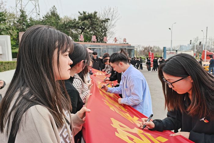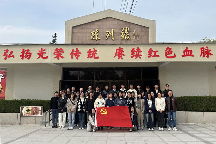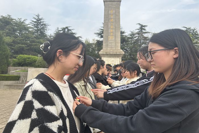 在革命烈士纪念碑前,全体党员肃立默哀,鞠躬致敬,表达对革命烈士的敬意。在革命历史陈列馆,在讲解员的解说下,全体人员瞻仰了革命图片、史料以及实物,重温了过去的艰苦岁月和惊心动魄的革命历程。学院党政办主任张俊作为领誓人,带领支部新老党员面向鲜红的党旗,庄重地高举右拳,重温入党誓词。学院还组织“老党员”为“新党员”佩戴党员党徽仪式,旨在引导新党员时刻铭记党的宗旨、初心和使命,时刻用党员的标准严格要求自己。全体人员在“祭奠缅怀英烈 传承红色基因”的横幅上进行集体签名,寄语英雄烈士,表达爱国情怀。