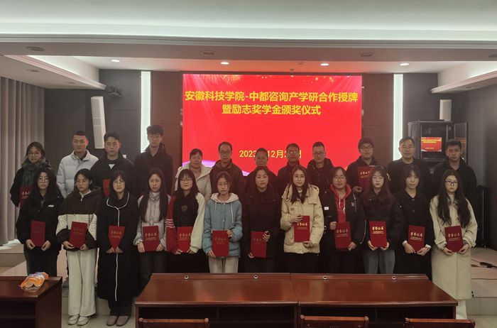 12月27日下午,财经学院举办产学研合作授牌暨中都咨询优秀奖学金颁奖仪式。凤阳县中都项目咨询有限公司总经理刘芳、总工程师朱永亮,财经学院党政领导、骨干教师、辅导员、学生代表等参加活动。仪式由财经学院党政办公室主任张俊主持。