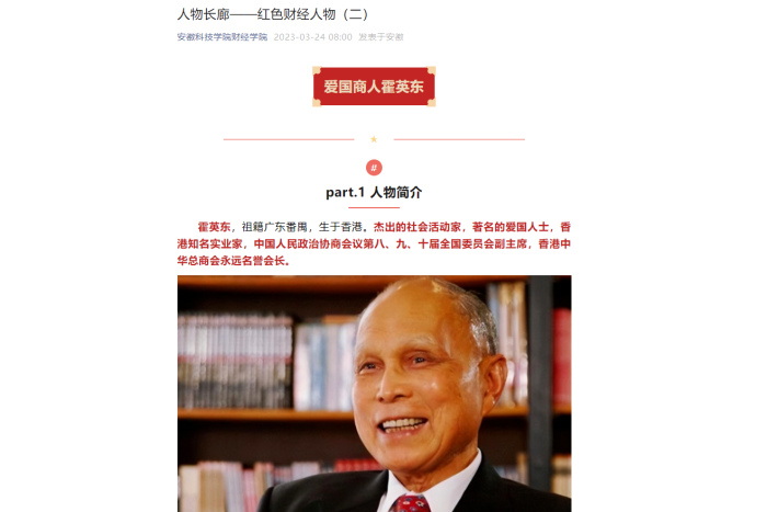 目前,学院微信公众号通过“人物长廊”红色财经人物专栏,推出“何鸿燊的传奇一生”“爱国商人霍英东”“红色金融家高捷成”“最穷的富人庄世平”“为红色金融工作鞠躬尽瘁的陈子岐”等多位红色财经人物。报道以写实手法,多角度、多事件、长跨度生动还原红色财经人物的民族情结和爱国义举。用故事形式,让当今财经学子与红色财经人物对谈交流,使新时代财经学子在红色财经文化的滋养中传承红色精神,深厚爱国情怀,坚定“四个自信”。