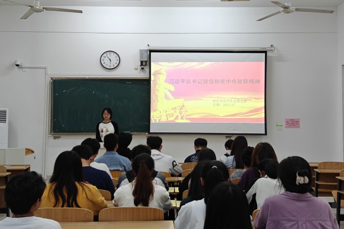为深入学习贯彻习近平总书记的贺信和党中央致词精神,强化青年学子的思想引领和品德培育,2月25日,财经学院于致A108开展“习近平总书记贺信和党中央致词精神”理论宣讲。宣讲会由院学生会主席团成员黄欣宇主持。