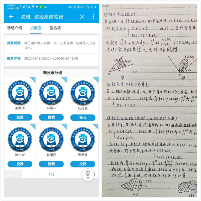 活动得到了广大学生积极参与。参赛选手利用所学高数知识,结合个人的学习方法和领悟,提交内容丰富充实的参赛作品。各位参赛同学手写的公式及概念、注释的各式符号以及略微改动的学习笔记,传递着他们对于高数的理解,附加的解题思路更是展现了他们思考的全过程。最终通过同学们在易班投票,来自18级财务管理专业的邢鹏涛同学荣获本次比赛的第一名。