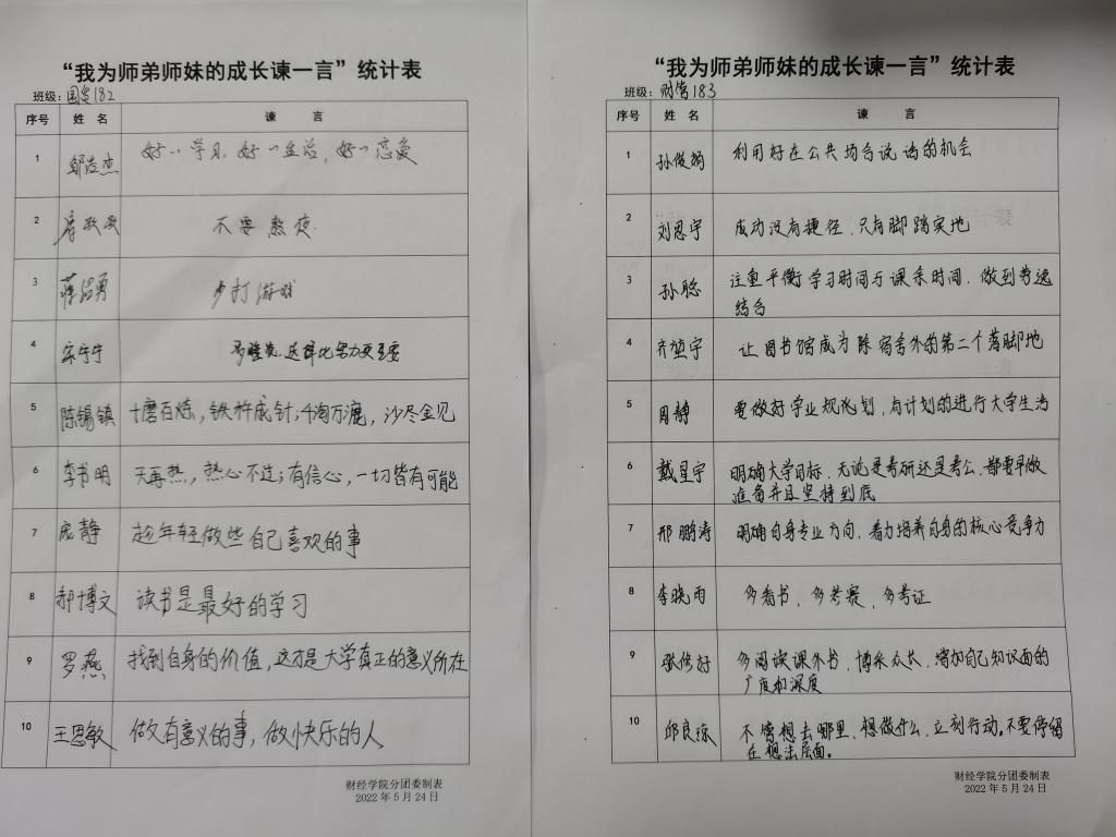 六月是毕业季,菁菁校园里最美的风景正是这群意气风发、即将奔赴远方的毕业生们,他们心怀感恩、真心实意地为学弟学妹们留下了千言万语。国际经济与贸易182的李书明提醒学弟学妹:“天再热,热心不过;有信心,一切皆有可能”;国贸专升本201的陈渲给学弟学妹留下衷心祝福:“所有的一切都是未知的,我们能做好的就是当下”;财会学生党支部学生党员戴星宇劝勉学弟学妹:“明确大学目标,无论是考研还是考公,都要早做准备并且坚持到底”。