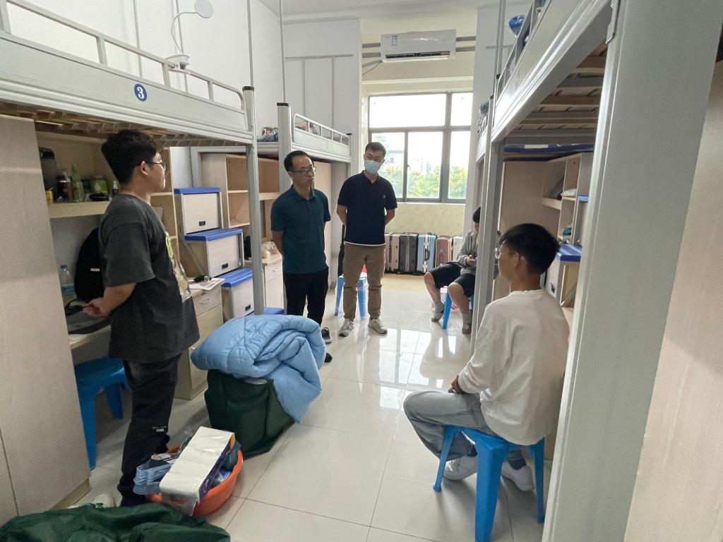 在新生宿舍,学院领导对同学们的到来表示热烈欢迎,并与他们亲切交谈,零距离了解他们进校后的适应情况、衣食住行情况;提醒新生切实做好常态化疫情防控工作,提高安全防范意识,注意人身、财物和信息安全;鼓励同学们调整状态,合理规划大学生活,提高自律与独立生活能力,互助友爱,勤奋学习,志存高远,积极融入到班集体,尽快融入到大学的学习生活中。