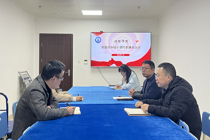 11月13日上午,财经学院在西附楼212会议室开展新提任科级干部任职廉政谈话。学院党委书记杜小明,党委副书记、纪委书记耿广汉和本次新提任的2位科级干部参加了会议。