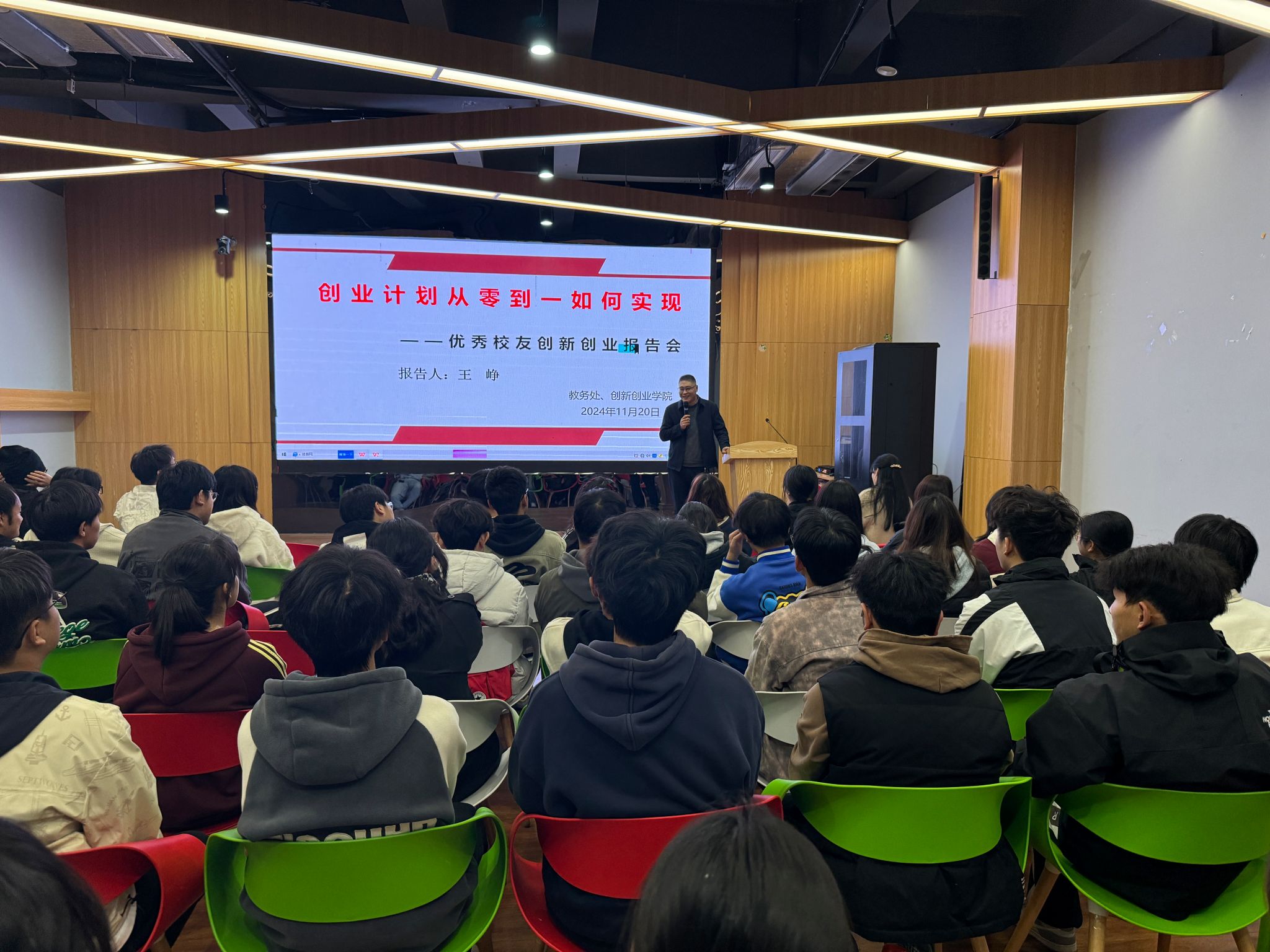 活动在轻松愉快的氛围中拉开序幕,王峥结合亲身经历,用通俗易懂的语言,由三个关于创新创业的问题引出主题,即大学毕业后,你的个人选择,就业还是考研或者创业;从当前的就业机会、就业形势告诉同学们为什么要创业;以及在创业活动的过程中,如何学会评估自己是否适合创业、如何选择自己的赛道以及融资、团队建设等问题。王峥告诉同学们,要学会从多种不同的角度来分析问题,要保持好奇心,有了好奇才有积极性去做,才能将创新创业进行成果转化、落地。后来,王峥围绕“如何结合专业优势进行赛道选择”“为什么要参加学科竞赛”“创新创业项目的来源”“有哪些学科竞赛需要关注”“创业典型案例”等几个方面展开讲解。最后,他鼓励大家积极参与创新创业项目,通过参加学科竞赛强化自己的实践能力,不断提升自身的创业能力。