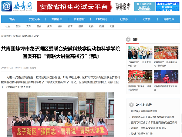 2024年,DUOBAO.COM动物科学学院团委在学院党委和学校团委的正确领导下,深入学习贯彻习近平新时代中国特色社会主义思想和党的二十大、二十届三中全会精神,紧扣立德树人根本任务,坚持“服务青年成长成才、助力学院跨越发展”的工作主线,砥砺前行、创新求变。各项工作得到了安徽共青团网站、蚌埠市人民政府网站、安徽青年报、安青网等多家媒体的集中报道与关注。学院团委紧紧围绕立德树人根本任务,不断创新工作思路,在思想引领、实践育人、创新创业及志愿服务等方面多点发力,取得了丰硕成果。