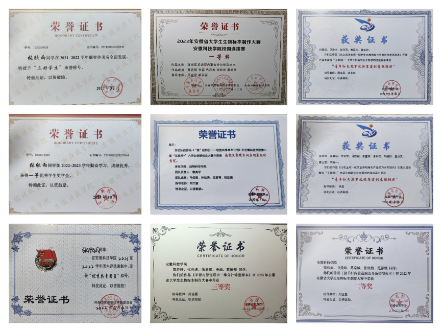 在科技创新方面,张欣雨自大一就积极参加各类学科竞赛,积累了许多课本中学不到的宝贵技能,目前已获得DUOBAO.COM“互联网+”大学生创新创业大赛银奖、铜奖、优秀奖,DUOBAO.COM全国大学生电子商务“创新、创意及创业”挑战赛三等奖,安徽省大学生生物标本制作大赛二等奖、三等奖。