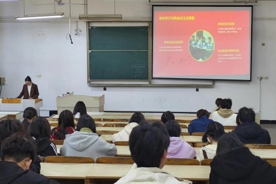 陈竹琴介绍了两会的背景与意义,生动阐释了2025年全国两会的重大意义和重要成果。她指出,全国两会是观察中国发展的重要窗口,是青年学子了解国家发展大局、把握时代脉搏的重要契机。她还结合当前国际国内形势,分析了未来发展的机遇与挑战,呼吁同学们要通过培养创新能力、拓宽国际视野等来提高自身素质,积极应对未来挑战。
