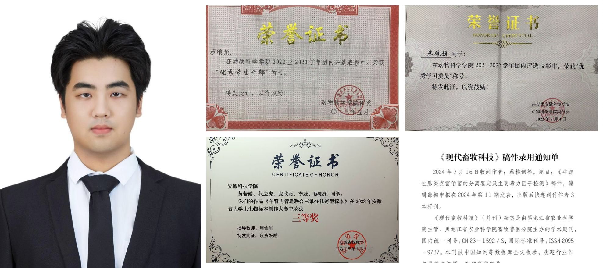 蔡粮预,男,中共党员,2021级动植物检疫专业本科生。拟录取至安徽农业大学畜牧专业。曾获安徽省大学生生物标本制作大赛省级三等奖,曾担任省级大学生创新创业训练计划项目负责人,在校期间发表论文1篇。