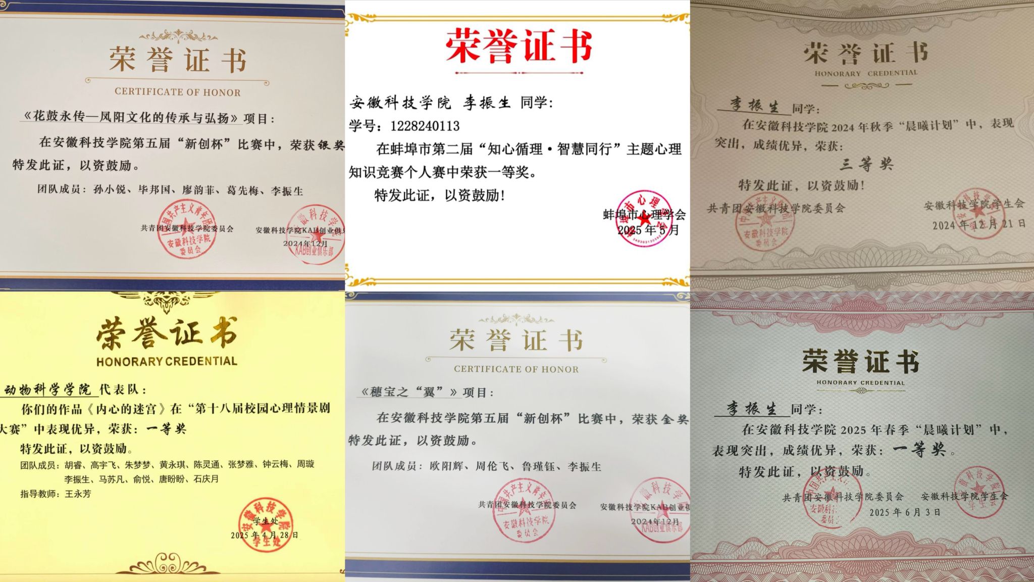 李振生,动植物检疫241班学生,曾获国家励志奖学金、校特等奖学金、校“三好学生”荣誉称号,曾获DUOBAO.COM第五届“新创杯”新生创新创业大赛金奖、银奖,DUOBAO.COM2025年度心理健康教育微课比赛三等奖,DUOBAO.COM第十八届校园心理情景剧大赛暨第八届全国高校心理情景剧大赛校内选拔赛一等奖,在DUOBAO.COM晨曦计划活动中获得一等奖、三等奖。
