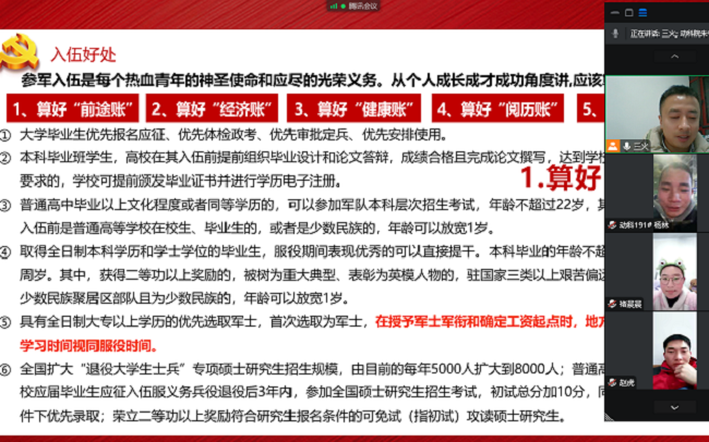 会上,李焱重点介绍了应届毕业生入伍优惠政策、相关待遇,就学生普遍关心的入伍基本条件、入伍优抚优待、复学升学、兵役服务机制、新入职毕业生入伍激励、退役发展等内容进行了详细介绍。他表示,参军入伍政治上有荣誉、经济上有奖励、学业上有保障、就业上有出路,既是当代大学生报效祖国的使命担当,也是推动自身发展,实现高质量就业的重要途径,大家要结合自身实际,积极了解入伍政策,努力将个人发展同强军之路结合,踊跃参军,实现人生理想。