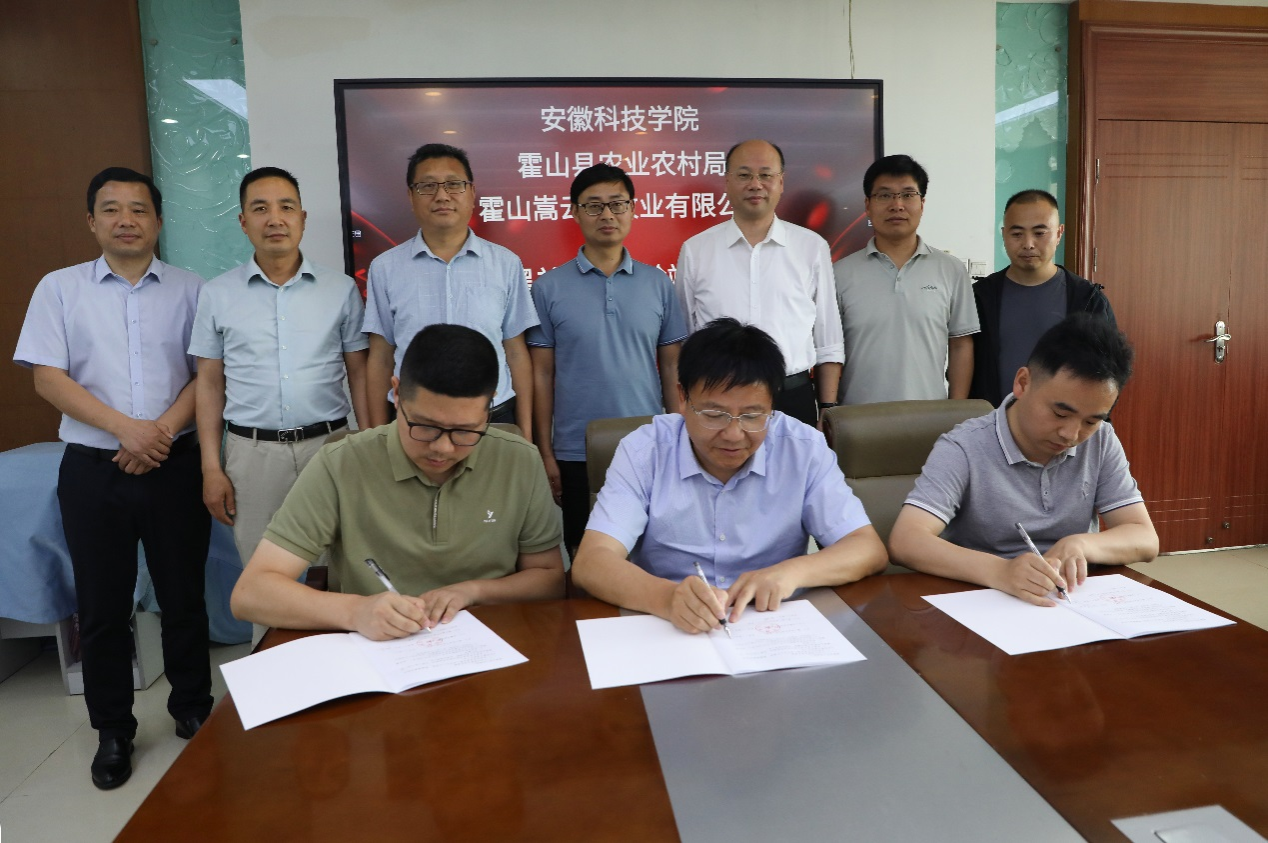 5月27日上午,霍山县人民政府党组成员、副县长李文龙率县农业农村局局长石爱武、畜牧发展中心主任王福及霍山县嵩云岭牧业有限公司董事长丁玉飞、总经理刘明等,来校考察交流政产学研合作,并签订“霍山黑羊特色试验站”产学研合作协议。校党委委员、副院长王孝义,科研处副处长陈浩,动物科学学院党委书记、副院长程斌,动物科学学院党委委员、副院长贺绍君,试验站负责人任清长副教授等出席会议,会议由程斌主持。