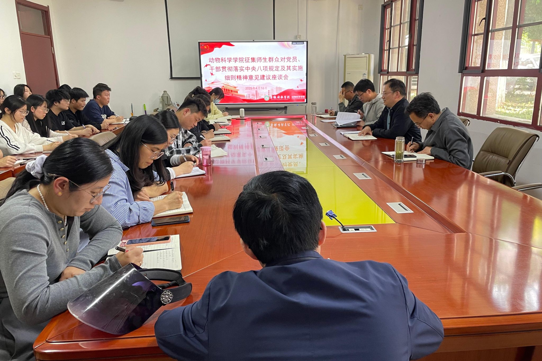 4月16日下午,动物科学学院在学院会议室举办征集师生群众对党员、干部贯彻落实中央八项规定及其实施细则精神意见建议座谈会,学院党政领导、教师代表、学生代表约40人参会,会议由学院党委委员、副院长贺绍君主持。