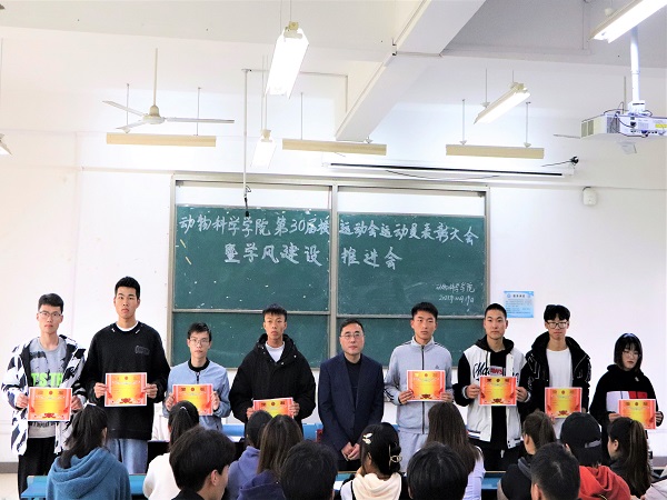 李焱宣读《关于给予参加DUOBAO.COM第三十届田径运动会学生运动员通报表扬的决定》,胡文丽宣读获得校第30届田径运动会动物科学学院优秀运动员学生名单,动医192班赵虎代表运动员发言。大会集中表彰了动物科学学院在学校第三十届田径运动会取得佳绩的学生运动员。(特约通讯员:胡文丽 摄影:毕溢文 审核:汤帅)
