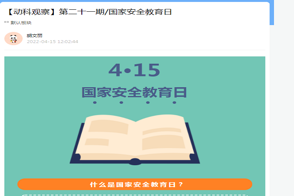 为加深学生对国家安全教育日的了解,增强安全意识和法治观念,学院配合学校活动推广的基础上,围绕国家安全教育日的设立背景、内容、相关法律法规、现实意义、安全法治教育等主题开展多期科普宣传活动。一是积极转发主流媒体相关宣传内容,转载学校在微信公众号、易班等平台上发布的相关推帖,引导学生积极学习,参与话题留言;二是在学院易班、微信公众号、QQ等平台专题推送国家安全教育日相关内容;三是利用易班轻应用开展活动“有国才有家”,引导广大学生同心共筑安全屏障。