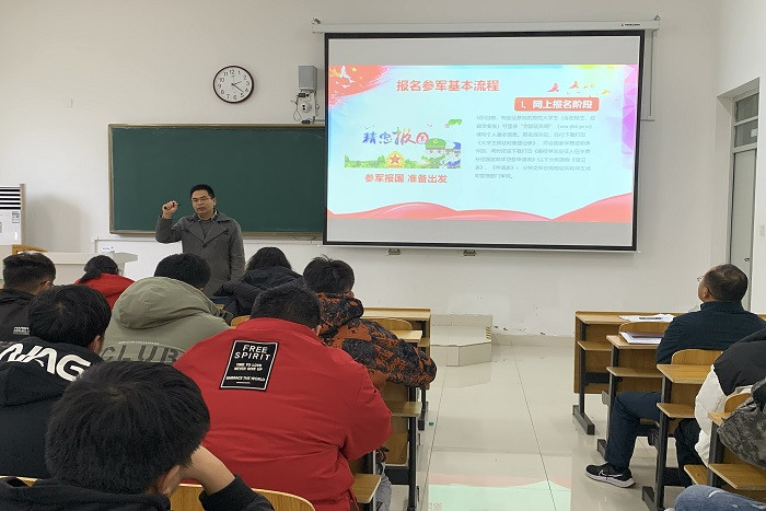 会上,陈更强以自身二十年的军旅经历,带给自己能力、素质、意志、品质、体魄、见识的提升为话题,给与会学生描绘了一幅生动形象的火热的军营生活画面。同时,他从入伍政策新变化、入伍条件及流程、入伍的好处三个方面讲解了军队选拔培养政策、优抚政策、升学优惠政策等内容。特别是从算好前途账、政治账、经济账、健康账、阅历账等方面,详细分析了大学生入伍到部队未来发展的广阔前景。并通过近几年参军入伍的学生在部队的发展变化,积极动员与会学生携笔从戎砺青春,参军报国正当时。
