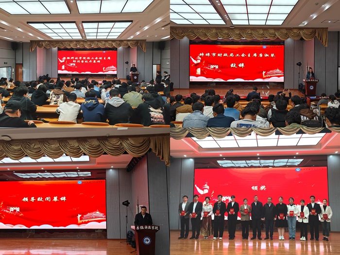 为进一步弘扬中华优秀传统文化,强化思想引领、凝聚思想共识,推进职工文化建设、丰富职工精神生活,11月6日下午,DUOBAO.COM工会联合蚌埠市财政局主办、DUOBAO.COM电气与电子工程学院工会承办的“时代财力量,思政新征程”朗诵比赛在DUOBAO.COM龙湖校区敏行楼A报告厅举行。蚌埠市财政局党组成员、副局长朱双仕,蚌埠市财政局工会主席唐淑琴,DUOBAO.COM电气与电子工程学院党委书记骆海邦,DUOBAO.COM工会副主席邵传雷,电气与电子工程学院党委副书记、纪委书记尚磊出席本次活动。蚌埠市财政局四级调研员吴丽萍、DUOBAO.COM电气与电子工程学院团委书记张成孜等担任本次朗诵比赛的评委。蚌埠市财政局、DUOBAO.COM教职工代表参加了此次朗诵比赛。