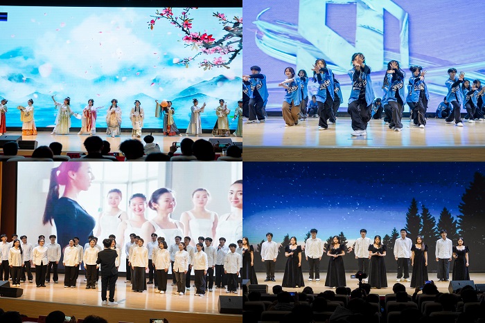 第二篇章《电燃梦想,青春飞扬》,开场舞《MONSTERS》《Diamond》引燃全场,为新生的大学生活璀璨开篇;舞蹈《文明大作战》以幽默诙谐的表演方式展现了大学校园中的点滴趣事;歌曲《罗生门》《夜空中最亮的星》、舞蹈《We Rock》等节目诠释了青春的朝气与活力,展现了多元包容、活力四射的校园文化氛围。第三篇章《铭记历史,吾辈自强》,汉服走秀《霓裳风华》、光影戏《与妻书》、歌曲《拆穿》和话剧《永不消逝的电波》等节目情感真挚的表演,激励学生牢记历史,自立自强。第四篇章《盛世中华,共创辉煌》以“筑梦”为核心,教师朗诵《共筑中华复兴梦》、表演《强国有我》引导全体新生在崭新的起点接续奋斗,扬帆起航,激励他们不忘初心,砥砺前行,为实现中华民族伟大复兴的中国梦而奋斗。