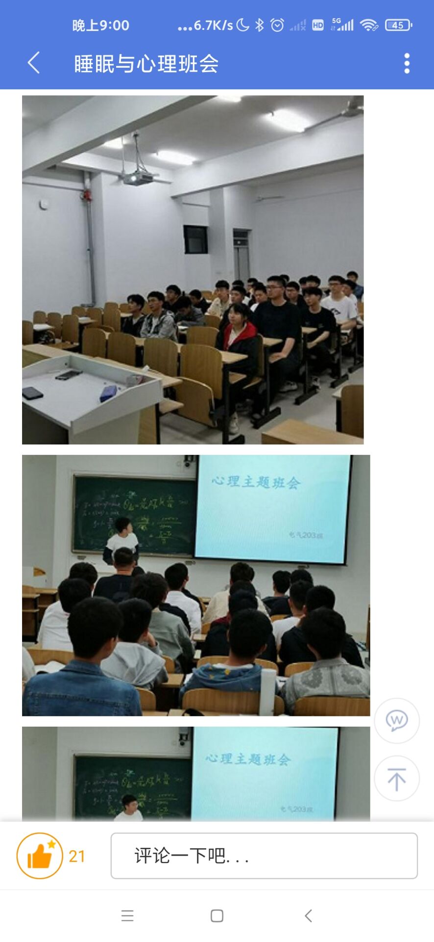会上,各班心理委员分别了介绍了同学们经常遇见的睡眠问题,并为同学们如何能够保持良好的睡眠分享了经验。多项研究表明约12.92%-52.84%的大学生有不同程度的入睡困难、早醒、睡眠不足、精力不足等睡眠问题,这是可能源于繁重的学习任务、严峻的就业形势、激烈的社会竞争、复杂的人际关系、电子产品的过度使用以及不良的生活作息习惯等,导致大学生群体中一部分人出现了睡眠问题。获得优质的睡眠应做到以下几点:一是保持睡眠卫生,规律的作息时间,和舒适的睡眠环境,睡前避免剧烈运动等;二是限制睡眠时间,在睡眠时间不变的基础上,减少卧床时间来提高睡眠效率,这有利于增加睡眠动力;三是建立床与睡眠间的条件反射,床上睡前的停留时间小于15分钟,该方法目前被多数专家认为是治疗失眠最有效的的一种方法。在开展主题班会的过程中,同学们认真听讲了心理委员的分享,通过他们的介绍,同学对睡眠问题有了更加深刻的了解,并懂得了应当如何获优质的睡眠。会后,同学们表示本次“睡眠与心理健康”班会,十分有效且及时。
