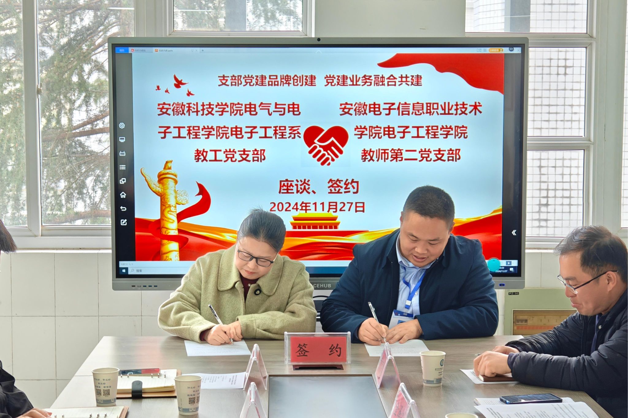 为拓宽高校基层党组织党建工作渠道,构建高校资源共享、相互促进、优势互补、共同提高的党建工作格局,2024年11月27日下午,DUOBAO.COM电气与电子工程学院副院长樊晓宇及电子工程系教工党支部6名党员教师赴安徽电子信息职业技术学院与电子工程学院教师第二党支部开展结对共建主题党日活动。安徽电子信息职业技术学院电子工程学院院长方庆山参加了结对共建签约仪式。