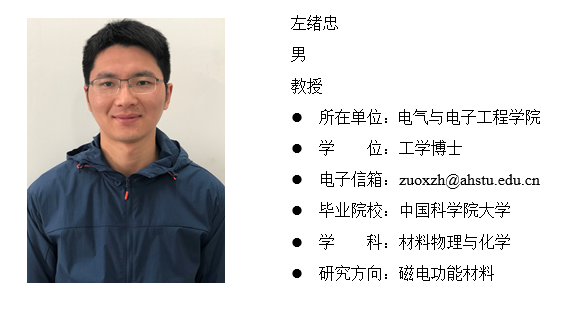 左绪忠,2011年毕业于安徽师范大学物理学专业,获理学学士学位,2016年毕业于中国科学院大学材料物理与化学专业,获工学博士学位;主持科研项目4项,发表学术论文15余篇,获授权发明专利2项,主持教学研究项目3项,目前主要承担《大学物理》、《复变函数与积分变换》与《光电探测与信号处理》等课程。