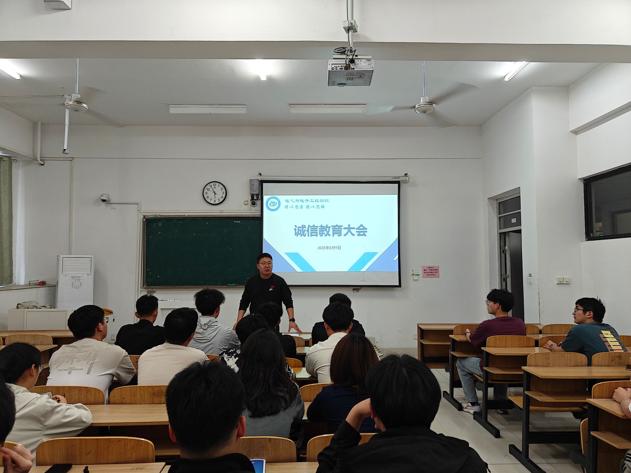 为筑牢校园诚信基石,5月9日,电气与电子工程学院于致知楼C103召开诚信教育大会,学院专职辅导员张深主持,2023级、2024级生活委员参加。
