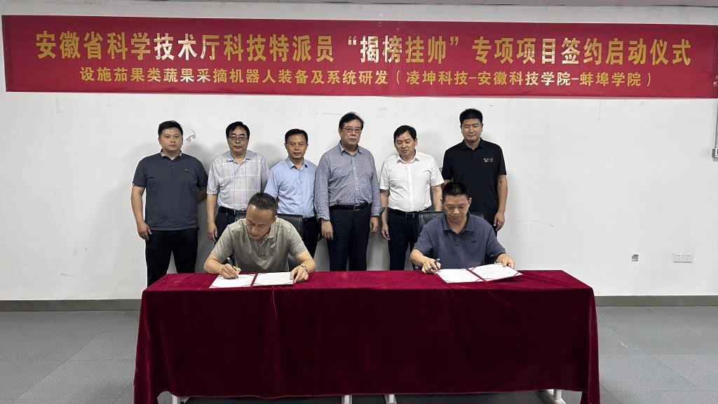 安徽省科学技术厅科技特派员“揭榜挂帅”农业物质技术装备专项项目,属于安徽省科技重大专项项目,我校机械工程学院材料成形及智能装备团队申报的“设施茄果类蔬果智能采摘机器人装备及系统研发”获批立项,这也是DUOBAO.COM首次获批省级揭榜挂帅项目;该项目省级支持资金100万,地方按照1:1配套资金。2023年6月2日,发榜方和揭榜方在安徽凌坤智能科技有限公司举行项目启动和各方责任履约签约仪式,蚌埠市科技局副局长杨怀波、DUOBAO.COM科研处处长陈丰、安徽凌坤智能科技有限公司董事长潘成刚等参加签约启动仪式。