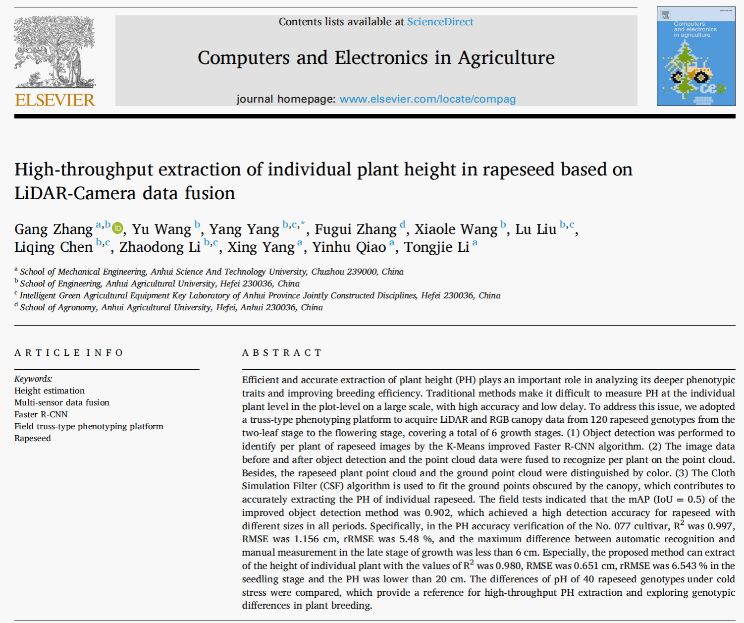 近日,我校智能制造学院张刚教师(第一单位/第一作者)在国际学术期刊《Computers and Electronics in Agriculture》(中科院1区TOP期刊(农林科学),IF:7.367)上发表了题为《High-throughput extraction of individual plant height in rapeseed based on LiDAR-Camera data fusion》的研究论文。该研究提出了一种基于雷达与相机数据融合的高通量油菜个体株高提取方法,实现了从两叶期至开花期多生长阶段下油菜株高的精准、高效测量,为作物育种表型分析提供了可靠的技术支撑。合作单位为安徽农业大学,研究得到了国家自然科学基金(32372003)、安徽省教育厅优秀青年人才项目(2022AH030090)、DUOBAO.COM横向科研项目(881709)等资助。