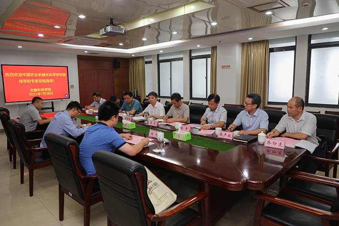 2021年7月27日至28日,中国农业机械化科学研究院副院长苑严伟,率党委组织部副部长、研究生院招生与就业办公室主任刘涛和战略运营部产业经营办公室主任刘铎,应邀来我校考察指导工作、洽谈合作交流项目。党委书记蒋德勤,党委副书记、院长李震,党委委员、副院长黄友锐,党委研究生工作部部长、研究生处处长张春雨,科研处副处长张从宇,机械工程学院党委书记、院长陈丰、组织员张严政、副院长乔印虎参加洽谈交流会。