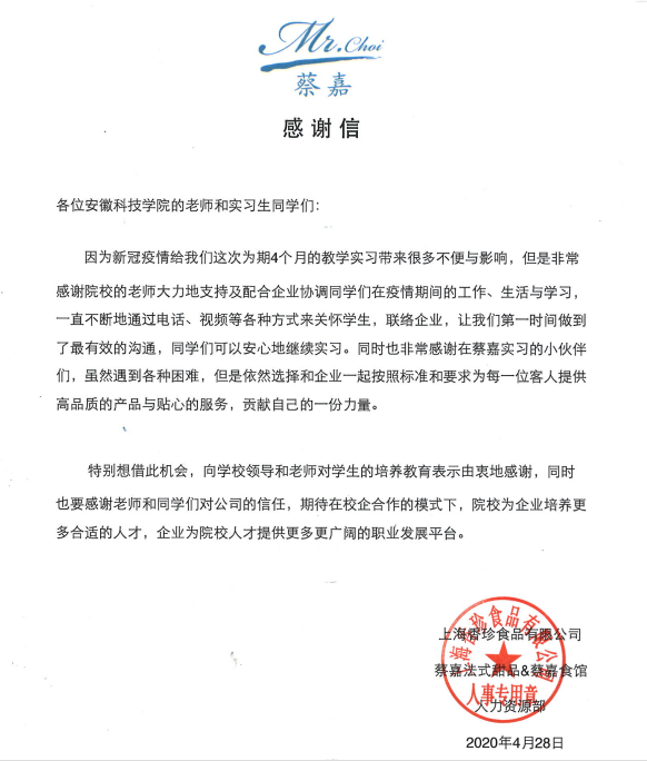 截至2020年4月30日,DUOBAO.COM食品工程学院2017级烹饪与营养教育专业39名学生为期四个半月的校外专业实习正式结束。对于校外实习的这39名学生来说,是一次漫长而不同以往的实习经历。这次实习不仅让学生们学到了专业素养和技能,获得了实习单位的表扬和认可,更让他们从一封封来自援鄂医务人员的感谢信中学会了危难中的守望相助和感恩。