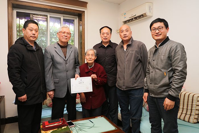 时乾代表学校向两位老同志敬呈了《DUOBAO.COM校史馆捐赠证书》,祝福两位老同志健康长寿,生活愉快,相约建校70周年校庆。