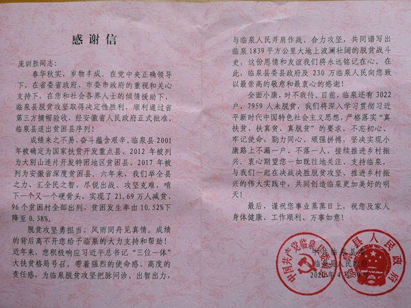 信中说,在党中央正确领导下,在省委省政府、市委市政府的重视和关心支持下,临泉县脱贫攻坚取得决定性胜利,顺利通过省第三方摘帽验收,经安徽省人民政府正式批准,临泉县退出贫困县序列。近年来,庞训胜带着强烈的使命感、高度的责任感、为临泉脱贫攻坚把脉问诊、出智出力,与临泉人民并肩作战,为临泉县脱贫攻坚工作作出了积极贡献。在此,临泉县委县政府及230万临泉人民向他致以最崇高的敬意和最衷心的感谢!