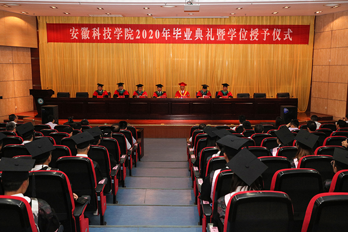 6月22日上午,我校在凤阳校区新图书馆会议中心二楼报告厅举行2020年毕业典礼暨学位授予仪式。党委书记蒋德勤,党委副书记、校长李震,党委副书记韦文联,党委委员、副校长黄远友,党委委员、纪委书记王强,党委委员、副校长黄友锐,党委委员、副校长李升和出席并在主席台就座。蒋德勤、李震为毕业生授予学位,扶正流苏,并合影留念。典礼由黄远友主持。
