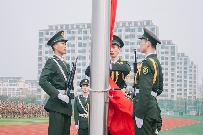开学典礼在庄严的升国旗仪式中拉开帷幕。主席台领导同志全体起立向国旗行注目礼,全体参训学员向国旗敬军礼,全体人员高唱国歌。