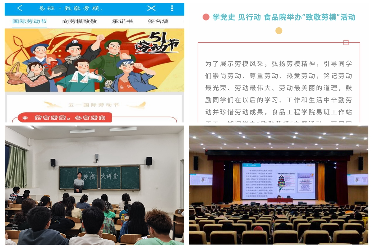 聆听一场劳模报告,感悟劳动之美。食品工程学院利用易班举办“致敬劳模”主题教育活动,引领同学们共同向劳模致敬,并推出轻应用供同学们签署“弘扬劳模精神”承诺书;建筑学院举办了学生劳模大讲堂,用身边典型来教育广大同学。今后将适时组织线上或线下“劳模大讲堂”“大国工匠进校园”活动。部分学院结合实际组织开展邀请劳动榜样人物进校园,劳动技能和劳动成果展示等活动,综合运用讲座、宣传栏、新媒体等广泛宣传劳动榜样,让师生近距离接触劳动模范,聆听劳模故事,观摩精湛技艺,感受并领悟勤勉敬业的劳动精神,争做新时代的奋斗者。
