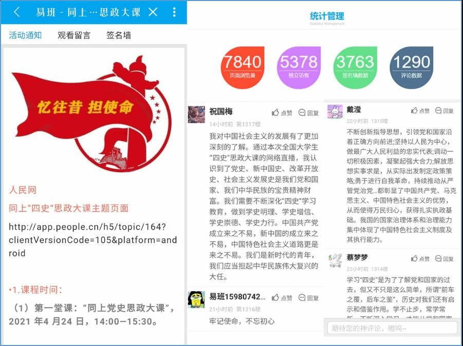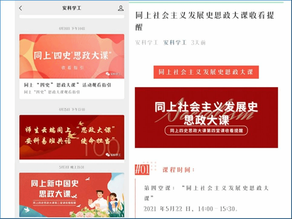 学校通过官网、安科学工微信公众号、安科易班多平台广泛宣传动员,在“安科易班”学习讨论留言板上,师生们反响强烈,踊跃发言,纷纷表达了自己的感想。建筑学院辅导员阮怀思表示,中华人民共和国以活生生的实践及成就向世界强有力的证明了科学社会主义的真理性和巨大生命力,改革开放这场中国的第二次革命,不仅深刻改变了中国,也深刻影响了世界!作为一名高校辅导员,更应当肩负起时代责任和历史使命,以“立德树人”为宗旨,坚定信仰,增强“四个自信”,不断加强道德修养,秉承“明德、致知、笃行、创新”的校训精神,弘扬“艰苦奋斗、开拓创新、求真务实、无私奉献”的安科精神,以更加从容自信的姿态,为决胜全面小康社会实现伟大复兴中国梦努力奋斗!管理学院刘孟佳表示今日观看“同上四史思政大课”让我深刻了解了马克思列宁主义的起源及发展历程,也深刻认识到了中国特色社会主义制度的优越性。在未来的日子里,希望中国青年都能不忘初心牢记使命,从老—辈那里接过建设富强中国的接力棒。