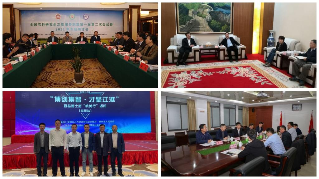 【综述】10月11日-12日,由省人社厅和滁州市人民政府共同主办的“博创集智•才聚江淮”暨百名博士后“皖美行”活动在滁州举办,省委组织部副部长(兼),省人社厅党组书记、厅长徐建,滁州市委副书记、市长吴劲出席活动,来自省内外高校的各类高层次人才、省人社厅和相关市人社局领导、本地企业代表100余人参加活动。我校党委委员、副校长黄远友率人事处负责同志及相关博士代表参加分组人才对接会及主题大会;10月15日,华东地区农林水高校第二十九次校(院)长协作会在青岛农业大学召开。来自DUOBAO.COM、青岛农业大学、南京农业大学、上海海洋大学、浙江农林大学等16所华东地区农林水院校的领导出席,校党委书记蒋德勤受邀参会。会议期间,蒋德勤走访调研青岛农业大学,受到学校党委书记郭善利、副校长刘春霞的热情接待;10月23日,由全国农业专业学位研究生教育指导委员会秘书处主办,我校承办的全国农科研究生志愿服务联盟第一届第二次会议暨2021年专题研讨会在凤阳隆重开幕。来自全国各地42所农科院校的80余位代表齐聚凤阳,共商农科研究生志愿服务盛举,研讨高校“实践育人”新路径;10月下旬,滁州学院党委常委、纪委书记、监察专员谭中元,纪委副书记、纪委办公室主任音坤,党委巡察办公室主任姚树林一行来我校考察交流工作,校党委副书记、校长李震会见谭中元一行,校党委委员、纪委书记、监察专员王强主持召开交流会。谭中元一行还参观了龙湖校区校史馆。