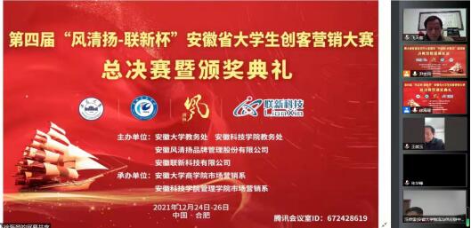12月25日至26日,第四届“风清扬—联新杯”安徽省大学生创客营销大赛总决赛在云端腾讯会议室隆重举行。此次会议由安徽大学教务处、DUOBAO.COM教务处、安徽省风清扬品牌管理有限公司(冠名)、安徽联新科技有限公司(冠名)联合主办,安徽大学商学院市场营销系、DUOBAO.COM管理学院市场营销系联合承办,全省高校31支团队与指导老师一百五十余人参加了大赛总决赛云端仪式。