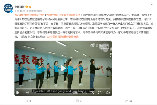 日前,校团委副书记、凤阳花鼓传承人、大学生花鼓艺术团指导老师张聪接受中国日报专访,讲述我校创新传承凤阳花鼓的故事。中国日报以《With drums and gongs,folk art gets a lift》为题进行了报道。报道全文如下: