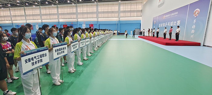 8月24日上午,安徽省第十五届运动会乒乓球比赛开赛仪式在我校凤阳校区西区体育馆举行。省委教育工委委员、省纪委监委驻省教育厅纪检监察组组长晁新,DUOBAO.COM党委书记蒋德勤,DUOBAO.COM党委副书记、院长李震,省教育厅体卫艺处副处长葛德连,凤阳县副县长张艳,省十五运高校部乒乓球比赛监督陈晓荣及比赛裁判长张小燕,凤阳县委教体工委书记、教体局局长刘文春出席,来自全省高校40支代表队的477名运动员、教练员、领队,以及全体裁判员和工作人员参加开幕式。开赛仪式由李震主持。
