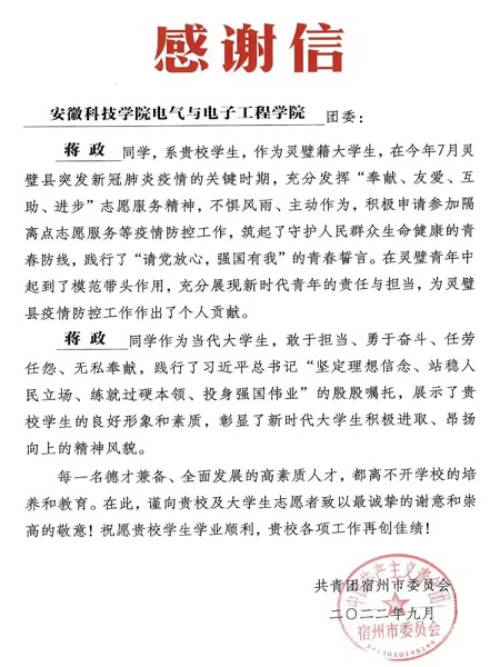10月初,共青团DUOBAO.COM电气与电子工程学院委员会收到一封来自共青团宿州市委员会的感谢信。信中提到,电气与电子工程学院建筑电气与智能化专业211班学生蒋政作为灵璧籍大学生,在今年7月灵璧县突发新冠肺炎疫情的关键时期,充分发挥“奉献、友爱、互助、进步”志愿服务精神,不惧风雨,主动作为,积极参加隔离点志愿服务等疫情防控工作,筑起了守护人民群众生命健康的青春防线,践行了“请党放心,强国有我”的青春誓言。