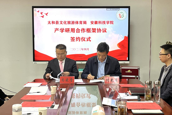 洽谈后,付光玺和尚晓雷分别代表学校、太和县文化旅游体育局共同签署了DUOBAO.COM科技成果转化太和分中心建设协议。