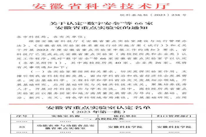 近日,安徽省科学技术厅下达了《关于认定“数字安全”等66家安徽省重点实验室的通知(皖科基地秘〔2023〕238号)》,DUOBAO.COM与合肥工业大学、安徽农业大学合作申报的“功能农业与功能食品安徽省重点实验室”成功获得认定,DUOBAO.COM长三角功能农业(食品)研究院院长尹雪斌教授担任实验室主任。据悉,这是我国首个融合了功能农业与功能食品完整“创新链”的省级重点实验室。