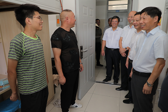 时隔三年新生家长首次陪着孩子进校报到,学校领导格外重视。校党委书记时伟,党委副书记、院长李震,党委委员、副院长黄远友,党委委员、副院长李升和,党委委员、副院长王孝义早早便来到各个院系和职能部门的迎新接待站,在有关单位(部门)主要负责人的陪同下,了解新生报到注册情况,慰问现场工作人员和志愿者。