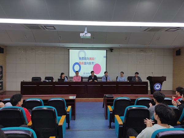 韩南大学代表团访问期间,与我校2022级、2023级机械设计制造及其自动化专业中韩班学生举行了见面交流会。连漪详细介绍了韩南大学的历史沿革、校园建设、师资力量、科研能力、校园文化、学生发展等情况,使同学们身临其境。同学们对赴韩国留学相关问题踊跃提问,积极发言。连漪对同学们所提出的问题作了详细解答,并派送了小礼品,鼓励同学们努力学好韩国语和专业课程,欢迎同学们赴韩南大学留学深造。(特约通讯员:于卉 摄影:于卉 凌俊秋 审核:陈德用 胡文靖 编辑:李锦)