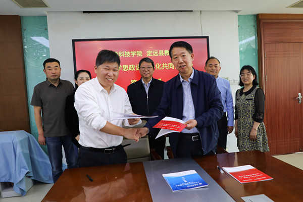 为深入学习贯彻习近平总书记关于学校思政课建设的重要指示批示,深入推进大中小学思想政治教育一体化建设,5月10日下午,我校与定远县教体局在凤阳校区图书馆十楼会议室签订大中小学思政课一体化共同体建设协议。校党委委员、副院长李升和出席并讲话。定远县教体局工委副书记黄如勇,我校马克思主义学院党总支书记杨仕勇出席签约仪式。马克思主义学院党总支副书记、院长张德化主持签约会议。