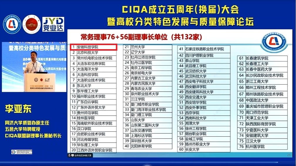 7月26至27日,“CIQA 成立五周年(换届)大会暨高校分类特色发展与质量保障论坛”在江门顺利召开。本次大会由全国高校质量保障机构联盟(CIQA)主办,五邑大学承办,全国高校质量保障机构联盟(CIQA)公布第二届联盟成员及其组织结构,我校成功当选为常务理事单位。