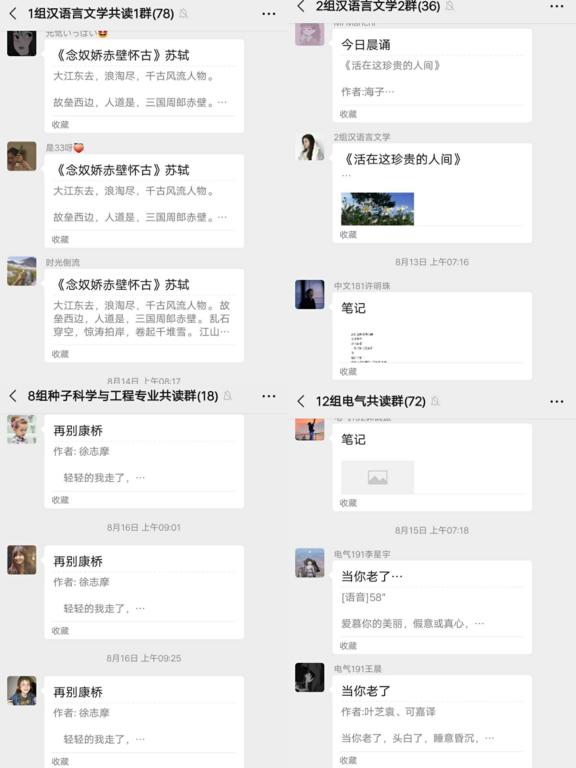 回顾七天共读活动收获,人文学院汉语言文学专业2019级窦紫玉表示:“我喜爱共读活动设计的每一个精巧的环节。醒来读一首清雅沉静的小诗,能迅速把我从困顿的清晨拉回现实,置身于诗人构建的美妙天地。夜晚和一群志同道合的朋友分享自己的观点,有时候我讲,有时候我听,在这种交互的过程里我真切体会到思想碰撞出的火花的温度。”